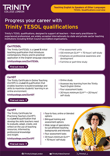 The Trinity Certificate in TESOL (CertTESOL) is an initial teaching qualification that provides a firm foundation for English language teaching. It is availableas a part-time, face-to-face, online, or blended course through a validated course provider. Find out more...